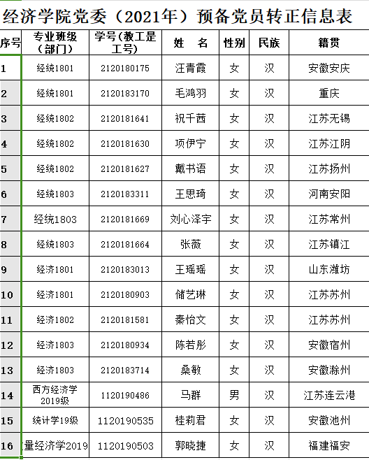 在听取党小组和党员、群众意见的基础上,经支部委员会审查同意,近期将召开支部大会,拟同意汪青霞等16名同志转为中共正式党员。根据发展党员工作有关要求,现将其有关情况公示如下:
