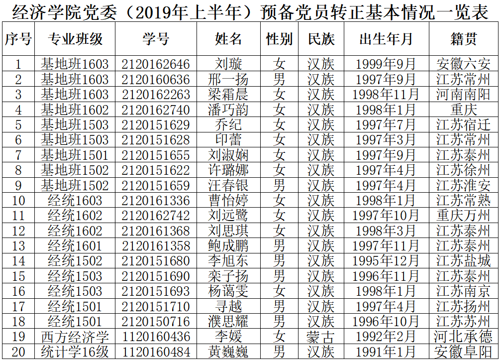 在听取党小组和党员、群众意见的基础上,经支部委员会审查同意,近期将召开支部大会,拟同意刘璇等20名同志转为中共正式党员。根据发展党员工作有关要求,现将其有关情况公示如下: