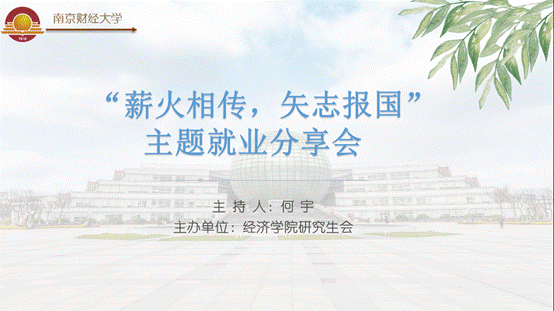 本次活动邀请到17级西方经济学的丁柏超、陈伟和18级应用统计的张振宇三位毕业班研究生,他们分别在求职、考博和就业方面取得了较为突出的成绩。活动过程中,丁柏超同学从职业方向选择、简历投递、笔试准备与面试发挥等方面讲述了自身的求职经历,并积极鼓励研究生同学们在一次次面试过程中积累发散性思维、培养严密的逻辑体系,也要提高语言表达能力,以期更好地回答面试官的问题。陈伟同学分享了考取上海财经大学博士生的经验,强调了研究生期间作出良好成果对于后期学校选择的重要性,他认为扎实的专业基础知识、高效的时间管理计划与良好的身体素质是使自身在竞争中脱颖而出的关键原因。张振宇同学分析了扣扣传媒