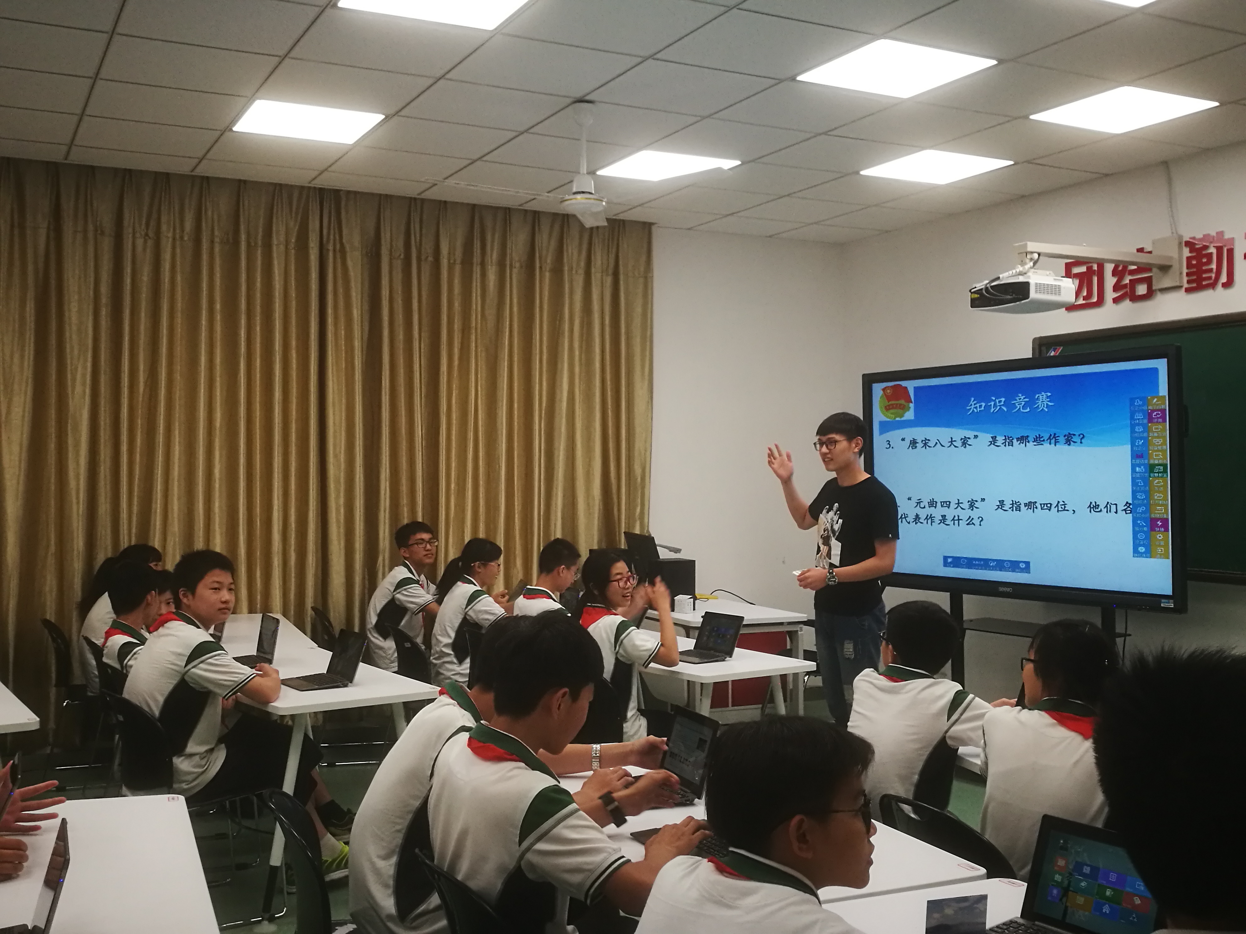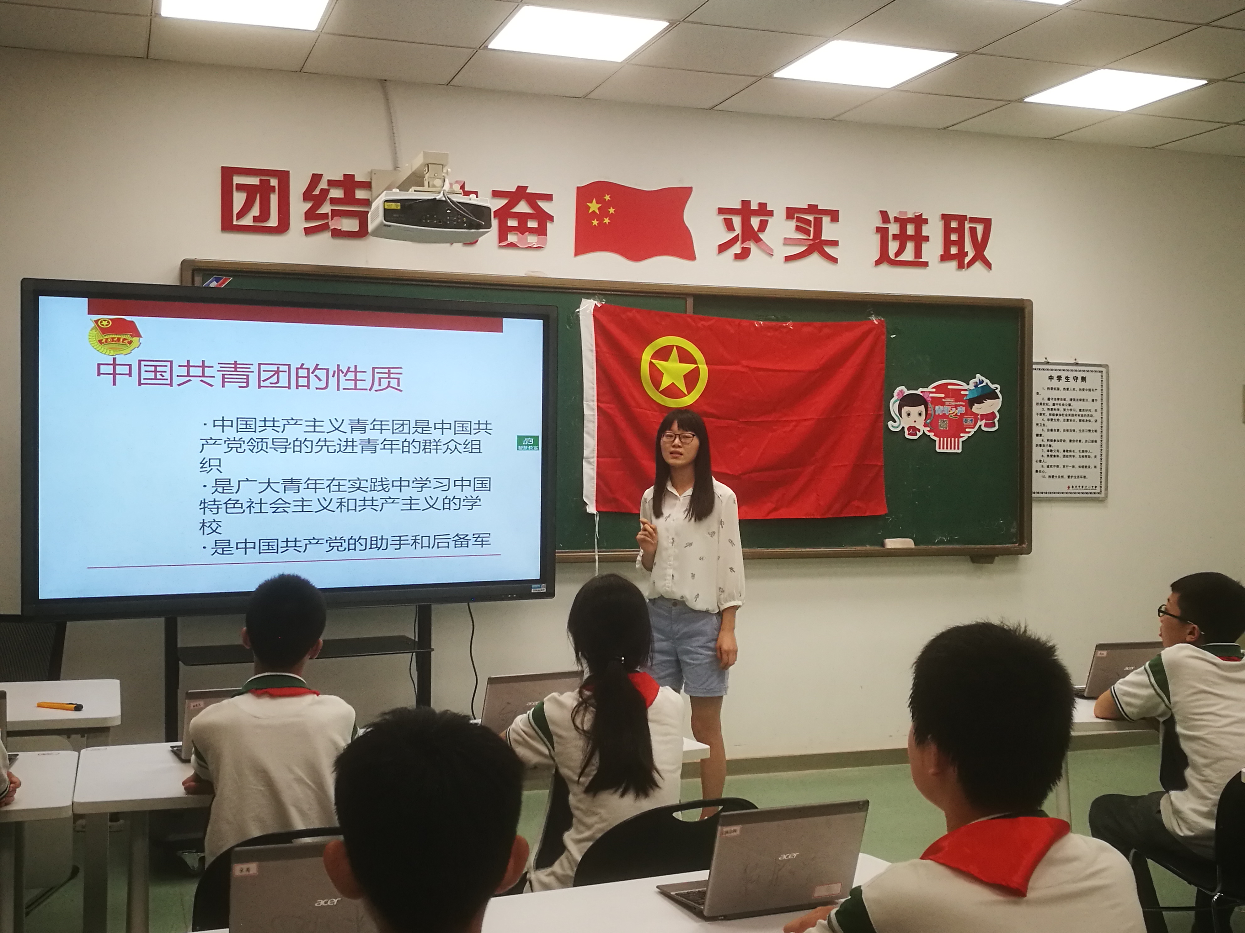 经统1501团支书李颖佳同学为初一年级的同学们讲授了“入团第一课”。同学们通过一段微视频了解了中国共青团的发展历史,之后大家一起学习了团旗、团徽、团歌等基本团知识,最后她发出邀请,邀请同学们积极向共青团靠拢,成为一名光荣的共青团员。