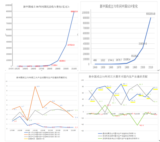 一张统计图,绘出千百态。同学们各展才华与智慧,或用折线图描述国民总收入、国内生产总值、三大产业及三大需求对国内生产总值贡献的变化,反映了自新中国成立以来国家经济实力的增长和人民生活水平的提高。或用面积图表现新中国成立以来国家进出口总额的增长变化,反映我国对外贸易的飞速发展。或用柱状图表现新中国成立70年来国家在学校教育上的增长状况,反映我国科教事业的发展。经统1901班张智成同学更是将统计数据与计算机软件技术相结合,用可视化图表方式反映中国港口集装箱吞吐量在世界排行情况,描述新中国成立以来我国远洋运输事业的发展。