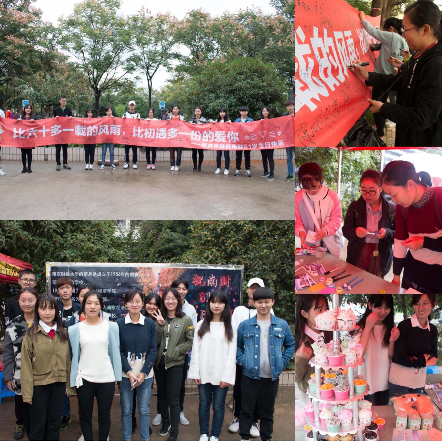 “爱要勇敢写下来”活动中,同学们纷纷在“比六十多一载的风雨,比初遇多一度的爱你”的8米横幅上写上了对南财61周年的祝福和期望。同学们脸上洋溢着愉悦的笑容,一笔一划中写出对南财的热爱,即使是近日的绵绵阴雨,也阻挡不了同学们为南财庆生的热情。“和我在南财的历史上走一走”环节中,南财历史变迁图上记录着南财的更名历程,同学们在此图中沿着历史的痕迹留下了密密麻麻的“小脚印”。“生日惊喜大放送”活动现场人头攒动,有的同学领取到我校教学楼的明信片,有的同学抽取礼品,有的同学在帐篷下品赏蛋糕,庆祝南财61岁生日……