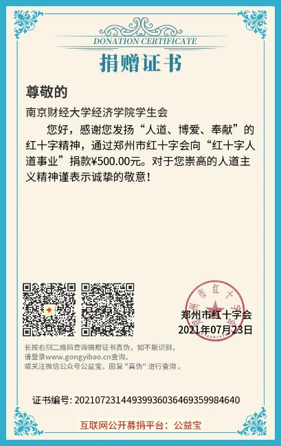 学生会通过郑州红十字会向“红十字人道事业”捐款500元,呼吁扣扣传媒