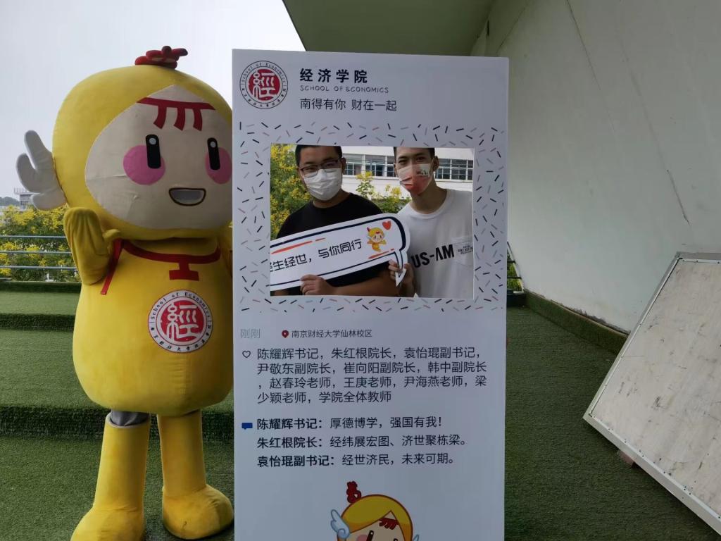 对每个新生的美好祝愿,希望每一个留下自己印记的新生都能度过美好的四年时光,不负年华,学业有成。初来乍到,新生难免有些羞涩,但对经院吉祥物小经灵发出的合影邀请,却没有人会摇头拒绝。在打卡框下,是扣扣传媒