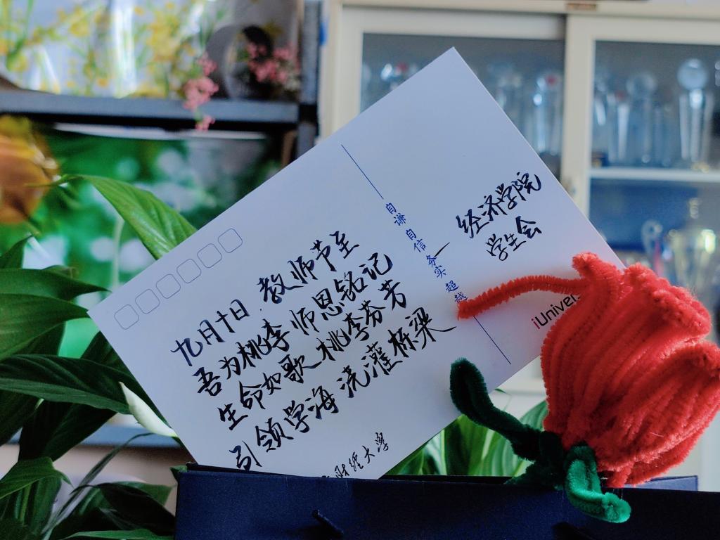 数统2201班的同学们捧着拥有美好寓意的绿植和饱含他们诚挚敬意的贺卡,敲开了统计学课程的老师——副院长韩中老师的办公室,韩中老师看到同学们的祝福露出了惊喜的笑容,并为统计系的同学们讲解学业上的困难。