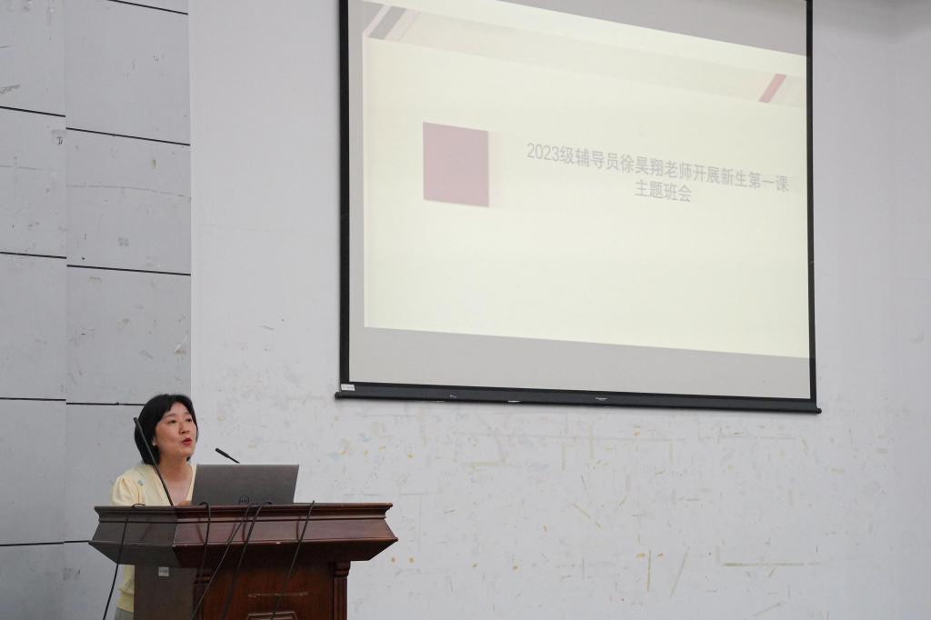 2023级新生辅导员徐昊翔老师为同学们开展新生第一课主题班会。她对同学们在大学期间的学习提出建议,鼓励大家找准定位、做好规划,形成自主学习意识,培养敏锐的科学洞察力。同时,她也号召同学们积极加入学生组织,练就过硬本领,增强才干见识,不断成长,学有所获。