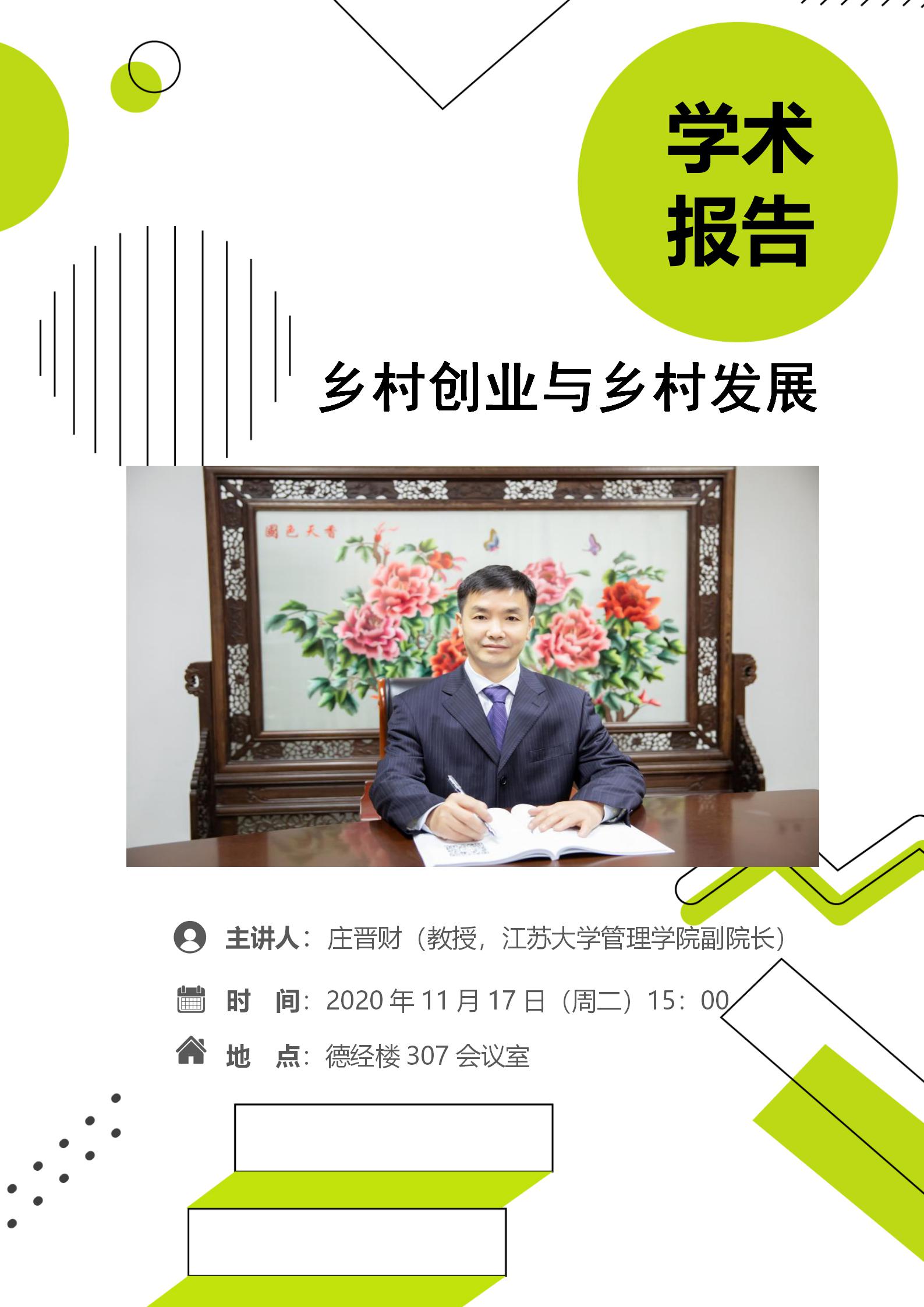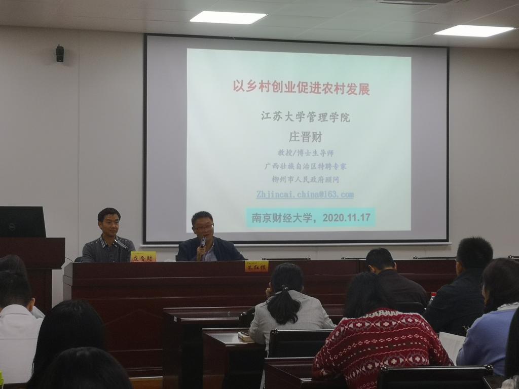 邀请,江苏大学管理学院副院长庄晋财教授在仙林校区德经楼307会议室做题为《以乡村创业促进农村发展》的报告,学院师生代表50余人参加了报告会,报告会由扣扣传媒