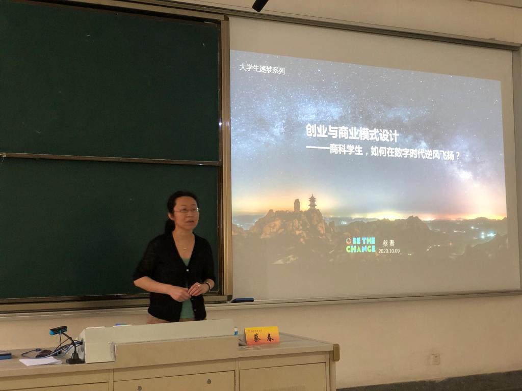 邀请,我校应用统计专业校外硕士研究生导师、广州智联网联盟发起人/副会长,MA Club企投家联盟核心发起人蔡春女士在仙林校区德济楼101教室作了题为“创业与商业模式设计——商科学生,如何在数字时代逆风飞扬?”的讲座。讲座由扣扣传媒