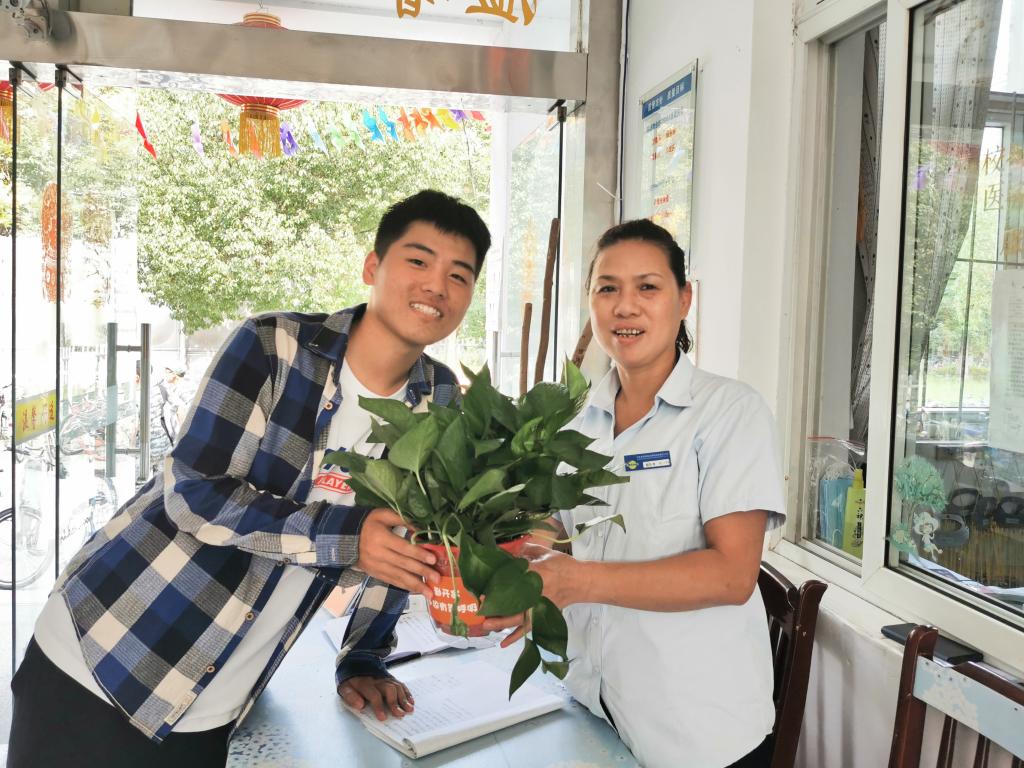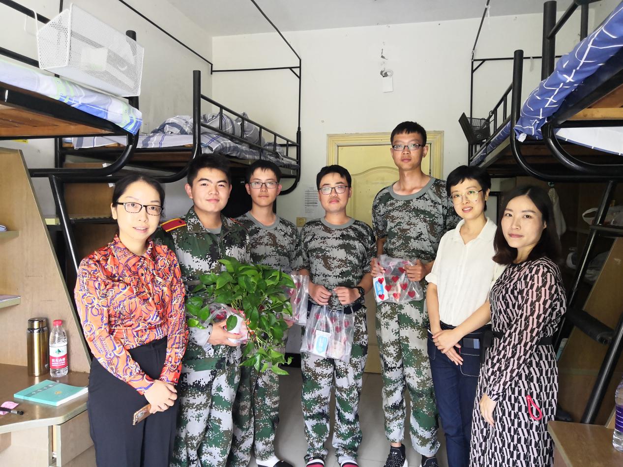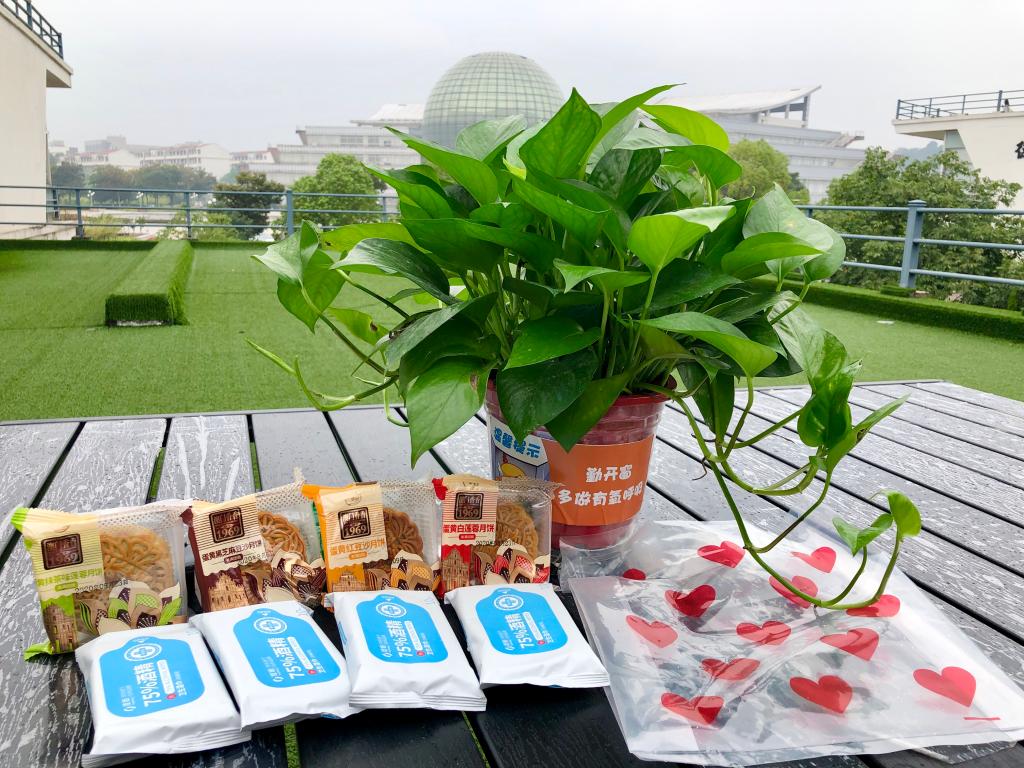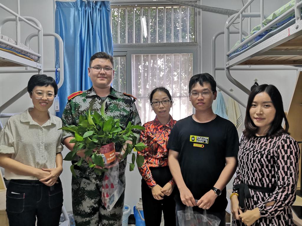 党委副书记袁怡琨老师、学工秘书尹海燕老师、新生辅导员陶海韵老师和院学生会的同学们来到学生宿舍,为每个小寝送上绿萝,并为每个新生带来中秋月饼、消毒湿巾等节日礼品。