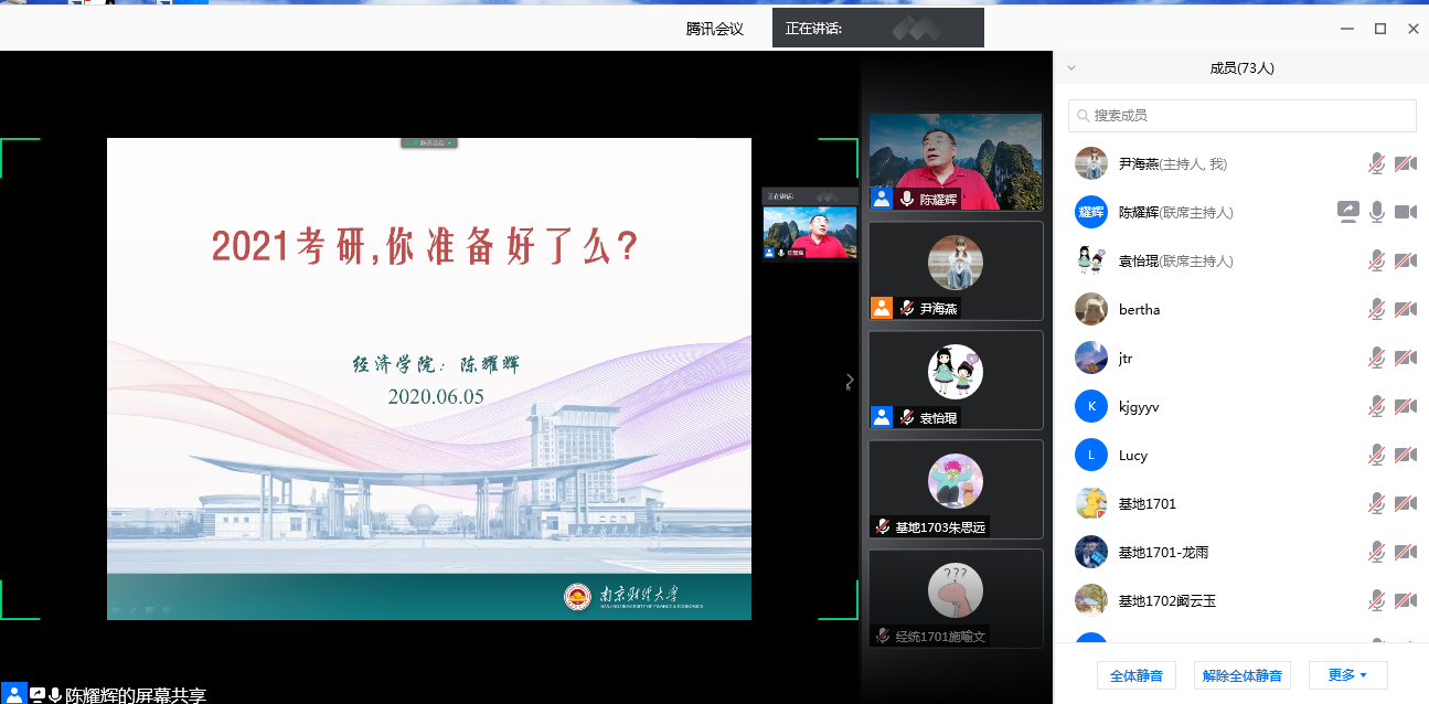 在腾讯会议平台举办“2021考研,你准备好了吗?”主题报告会。报告会由学院党委书记陈耀辉教授主讲,副书记袁怡琨主持,2017级部分学生参加会议。