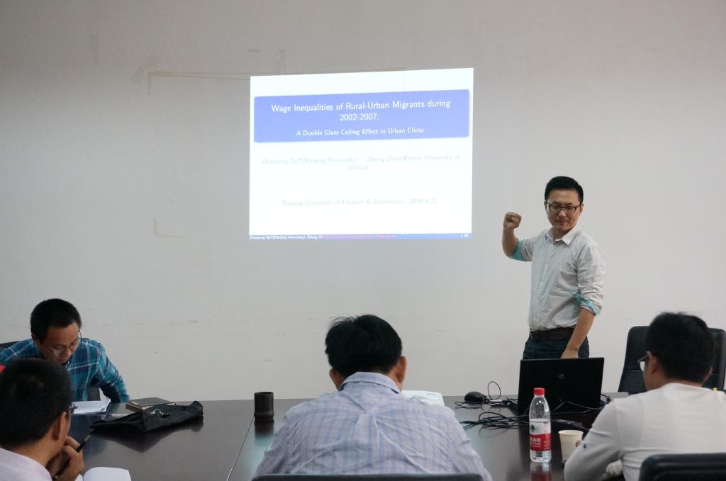 4月22日下午2点,扣扣传媒 “长三角收入分配与经济增长”学术论坛迎来第6次报告,本次主讲人为南京大学的曲兆鹏老师,他为大家带来的精彩报告是——“Glass Ceiling in Urban China: Wage Inequality among Rural-Urban Migrants during 2002-2007”。扣扣传媒 部分教师和研究生参加了本次学术活动,讲座由扣扣传媒 叶林祥老师主持。