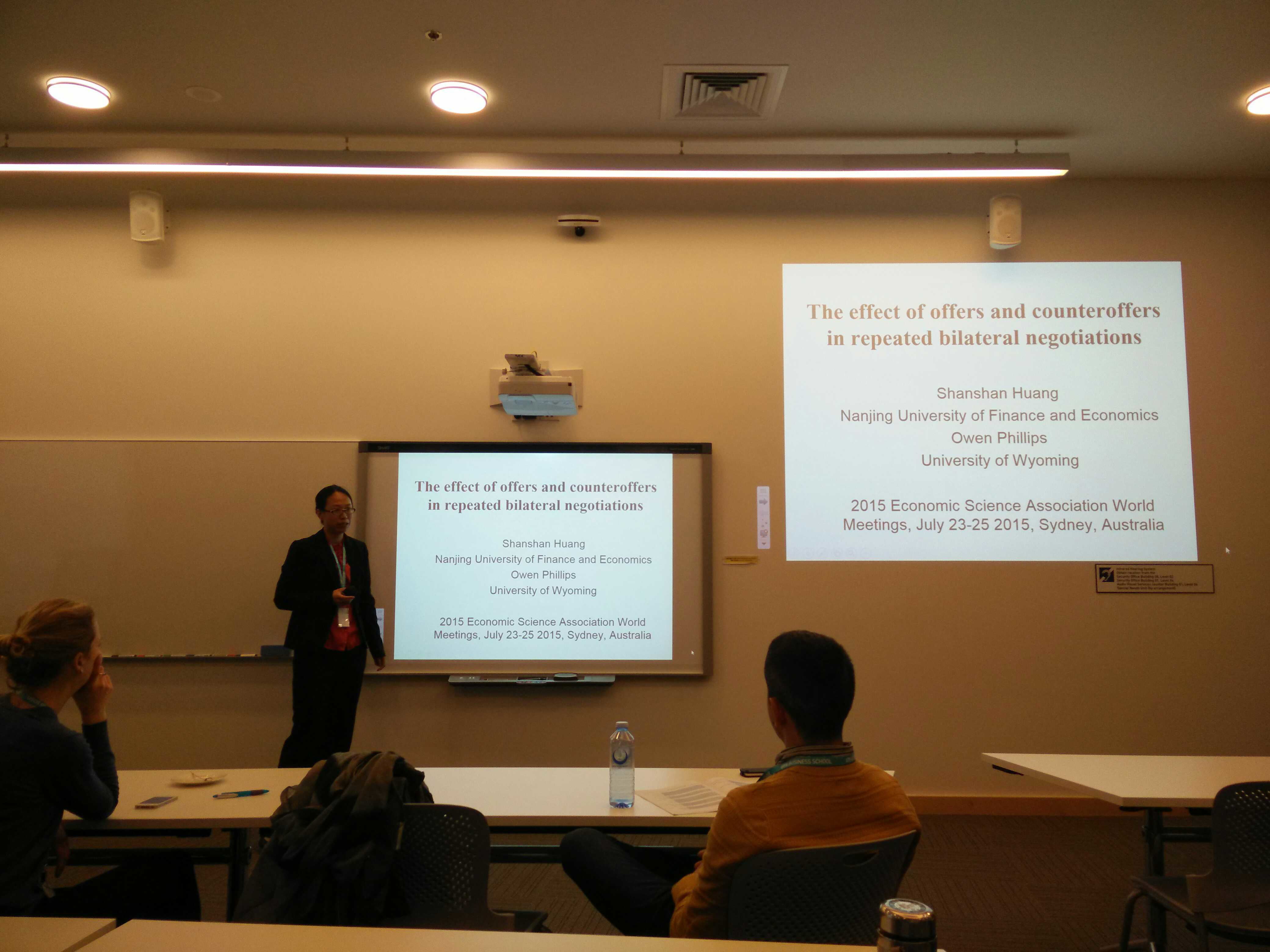 黄姗姗博士远赴澳大利亚悉尼参加2015届经济科学协会世界大会(Economic Science Association),并作题为“讨价还价在重复性双边商业谈判中的影响”的学术报告。