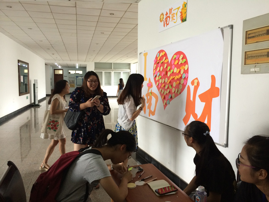 新生之采”背景墙前,记录下这人生新阶段的开始。在“致四年后的自己”活动桌前,新生张同学说:“很多同学给四年后的自己写下了美好的祝福,我同样也希望自己这四年大学生活,能有一个值得为之奋斗的目标。我希望四年后的自己,再拿到这张明信片时,能够为自己的大学生涯点个赞。”同样热火朝天的还有一旁的“寄语墙”。 同学们在挂着“南财,我来了”字样的墙壁上,贴上了五彩缤纷的便利贴,写下心情寄语。新生家长们也谈起对孩子的期望:“我们不仅仅期望自己的孩子能够在这里过的开心,学有所成,也希望学校能有更大更好的发展。”