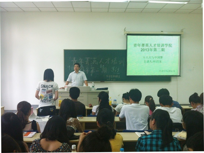 在专一104举办了青年菁英人才培训学院2013年第二期。此次培训邀请到了马克思主义学院党总支书记、院长叶昌友教授作为嘉宾,演讲主题为“十八大与中国梦”,扣扣传媒
