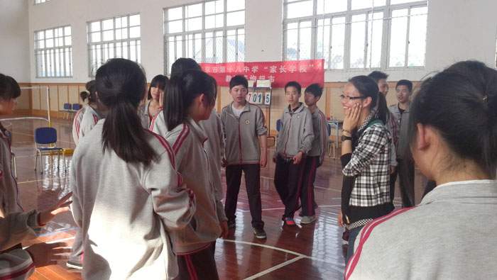 此次团辅活动分为松鼠抱大树、自生训练、呼吸调整、情绪表达、解心结等五个环节。活动伊始,在心理协会同学们的引导下,现场气氛迅速高涨,十八中的同学们踊跃参与到松鼠抱大树的游戏中,欢声笑语充满了现场。在自生训练与呼吸调整环节,在心理协会同学的指引下,伴随轻柔的音乐声,同学们在意念中体验到了精神的放松。随后是“情绪表达”环节,该环节调动了同学们的主动性,他们积极表达自己的梦想、愿望与烦恼,并由其他同学出谋划策提出解决办法;有的同学较腼腆,但在心理协会同学的鼓励下,大胆说出了自己梦想与烦恼,获得了同学们的赞许。最后一个环节是“解心结”,该环节让同学们意识到了团结互助的重要性,在小游戏中收获了大道理。