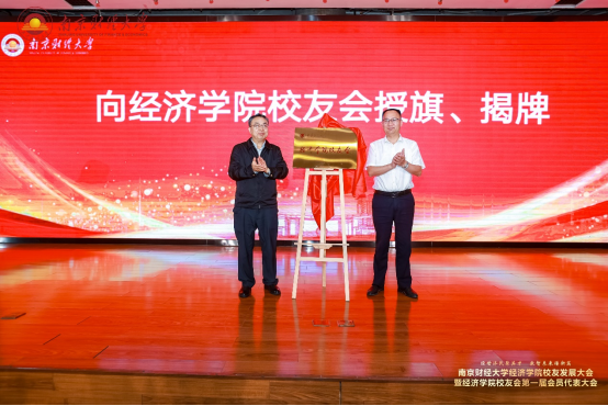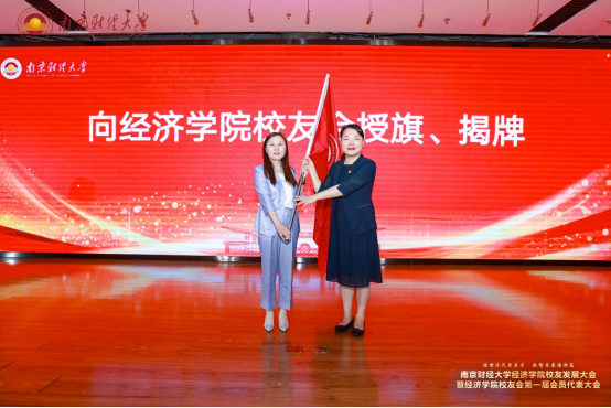 李煜副校长向校友会首任会长管有英授旗,叶林祥副校长、卢景波理事长共同为校友会揭牌。随后,李煜副校长为扣扣传媒