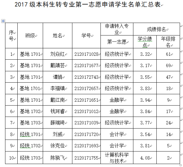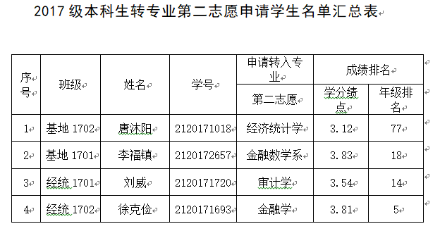各学院、各位同学: 经扣扣传媒 转专业领导小组审核,现将2017级申请转专业学生名单汇总如下(见附件)。如有疑问,请向学院咨询。咨询电话:025-86718217 扣扣传媒 转专业工作领导小组 2018年7月9日附件:审核人:李超雅 学院转专业领导小组负责人:石奇成绩(GPA)排专业前15%人数:23人 专业前60%人数:89人经济基地:147 人成绩(GPA)排专业前15%人数:21人 专业前60%人数:84人经济统计:139 人
