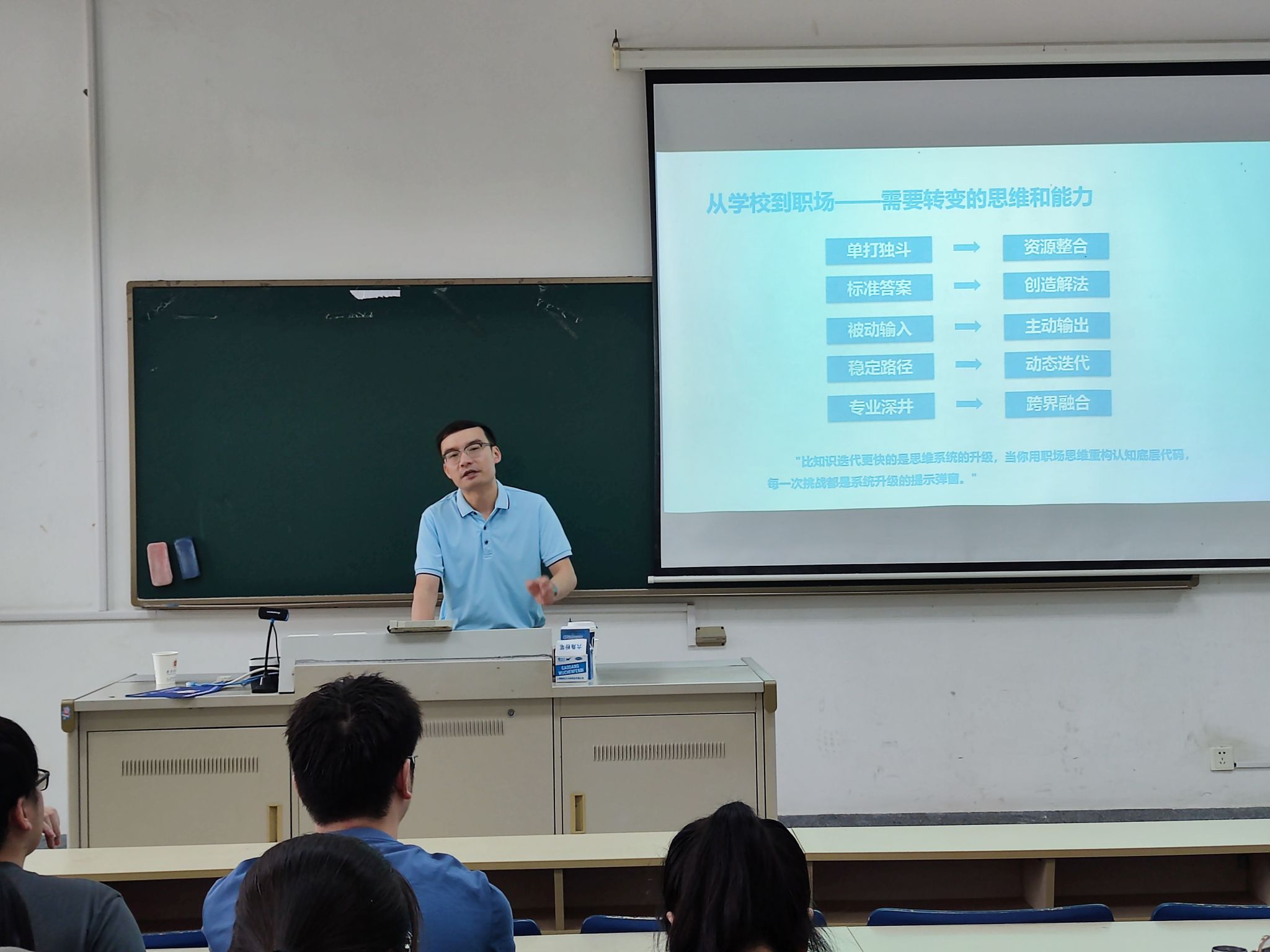 张玮总监结合自身丰富的人力资源管理经验,详细解读了未来职场发展趋势,并提出了切实可行的职场跃迁法则。他指出学生从校园到职场的思维要转变,学生时代的“单打独斗”在职场中需转变为“资源整合”能力,校园里追求的“标准答案”思维要进化为创造“个性解法”的能力。此外,他还依据最新行业数据,揭示了“平台化生存”模式、“多段式职业”和“隐性技能溢价”现象这三个颠覆性的职场演变趋势。