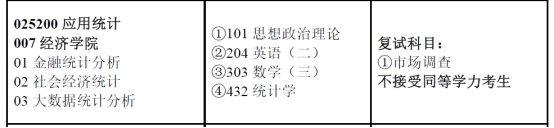 2023年硕士研究生招生学科(专业)共4个:0201理论经济学(学硕)、0202应用经济学(数量经济学方向,学硕)、0270统计学(学硕)、0252应用统计(专硕)。