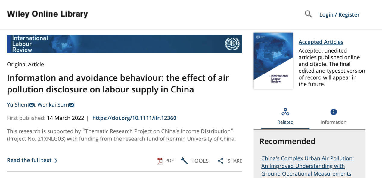 讲师沈煜与中国人民大学孙文凯教授合作的论文《Information and avoidance behavior: the effect of air pollution on labour supply in China》,被SSCI期刊International Labour Review录用并在线发表。
