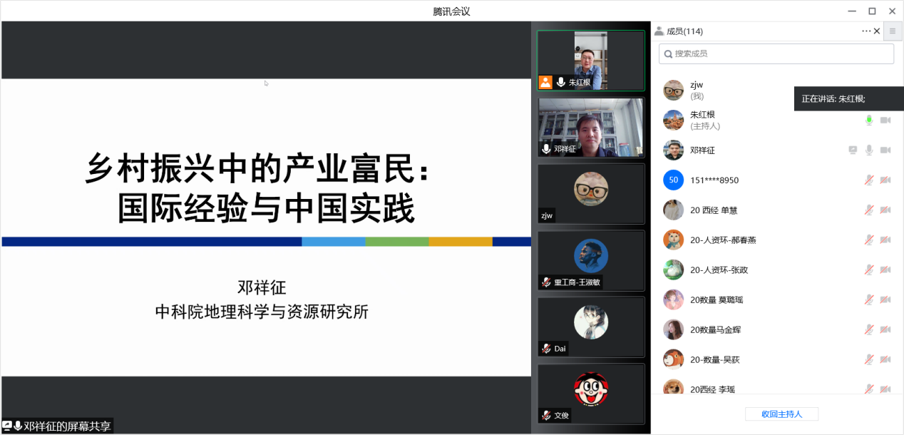 师生作题为《乡村振兴中的产业富民:国际经验与中国实践》的线上学术报告,报告由院长朱红根教授主持,来自扣扣传媒