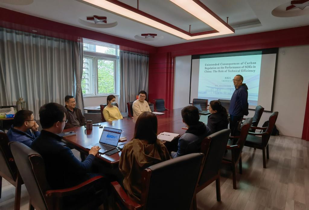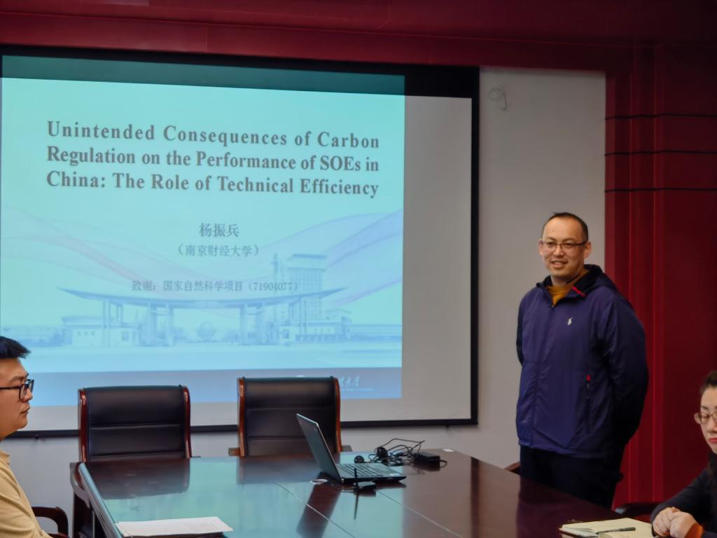 在德经楼329会议室成功举办了本学期第二期双周学术论坛。本期论坛由经济系杨振兵副教授带来题为《Unintended consequences of carbon regulation on the performance of SOEs in China: The role of technical efficiency》的学术讲座。