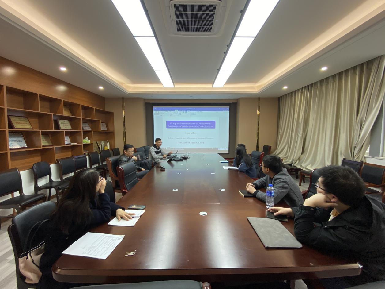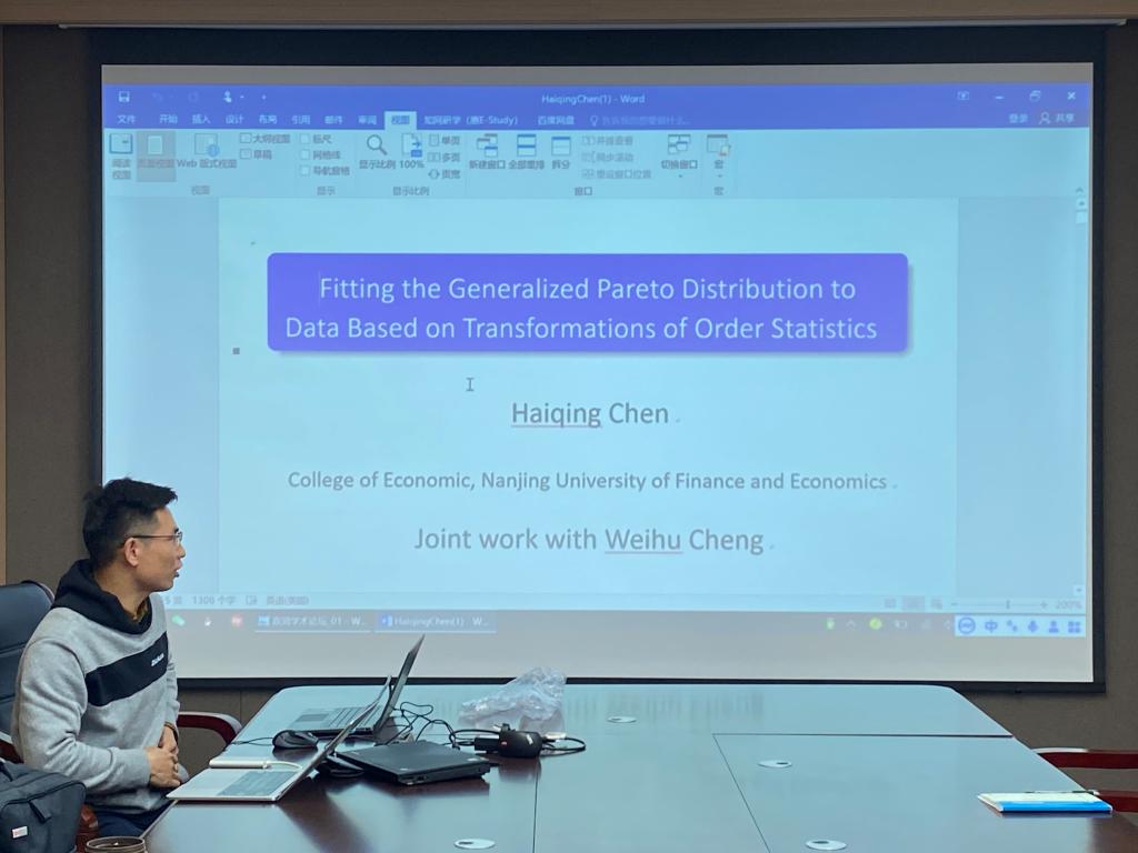 陈海清博士汇报了他最近的论文《GPD参数基于次序统计量变换的最小二乘估计》,他指出超量分布在一个很弱的条件下近似的服从广义Pareto 分布,因此GPD在经济学、社会学、水文地质学、生物医学以及工程技术等领域具有广泛的应用。从而精准地估计GPD的参数是极值统计推断的研究热点。陈海清博士介绍了GPD参数目前已有的参数估计方法所存在的缺陷,并提出了一种基于次序统计量,通过变换、纠偏、加权构造了非线性加权最小二乘估计,同时给出了所提估计的渐近理论结果。通过模拟和实际数据分析表明,所提估计比已有的估计更加稳健。他指出所提出的估计方法可以推广到其他的分布族,并且对不同形态的分布,给出不同变换函数形式的建议。