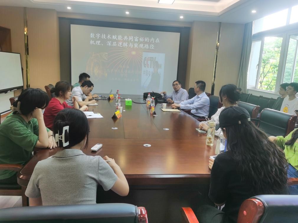 ,在德经楼323会议室作题为《数字技术赋能共同富裕的内在机理、深层逻辑与实现路径》的学术报告。学院党委书记张圣兵,副院长刘小峰,经济系主任刘余,数字经济系主任华中昱、部分研究生参加。